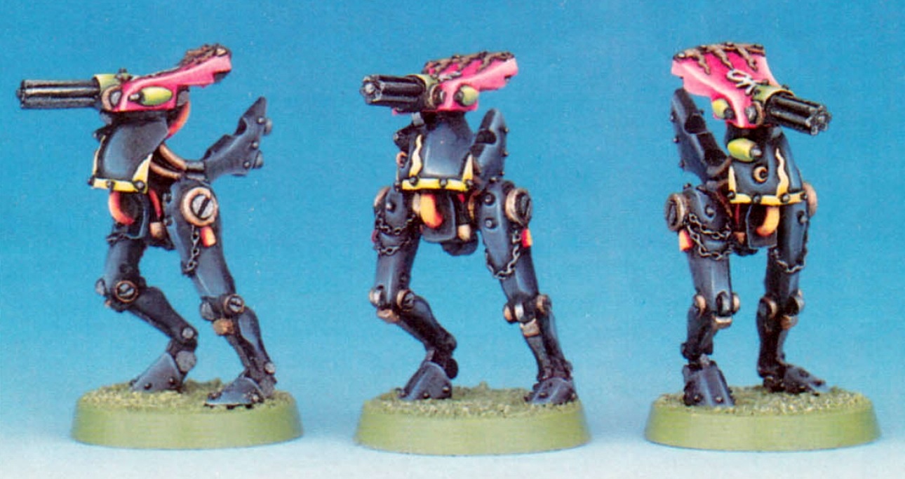 The pilots of these bipedal walking machines were protected by a hard shell of plasteel and armed with an array of military-grade heavy weapons. The suits proved invaluable: few, if any, natural predators or hostile alien warriors could stand against them, and they could travel through even the most dangerous environment with ease.