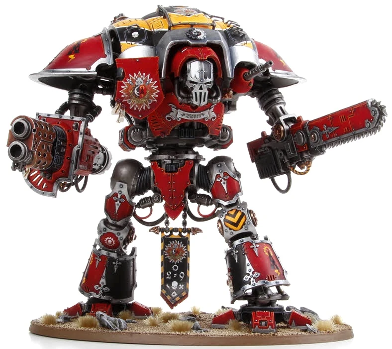 Vulnerable limbs and joints are protected by sweeping armour plates of adamantium and supported by an incorporated Ion Shield which responds to the thought-commands of its Noble pilot. The presence of just one of these towering engines of destruction is enough to change the course of a battle, and only the Titans of the Adeptus Mechanicus are more feared by the enemies of Mankind.