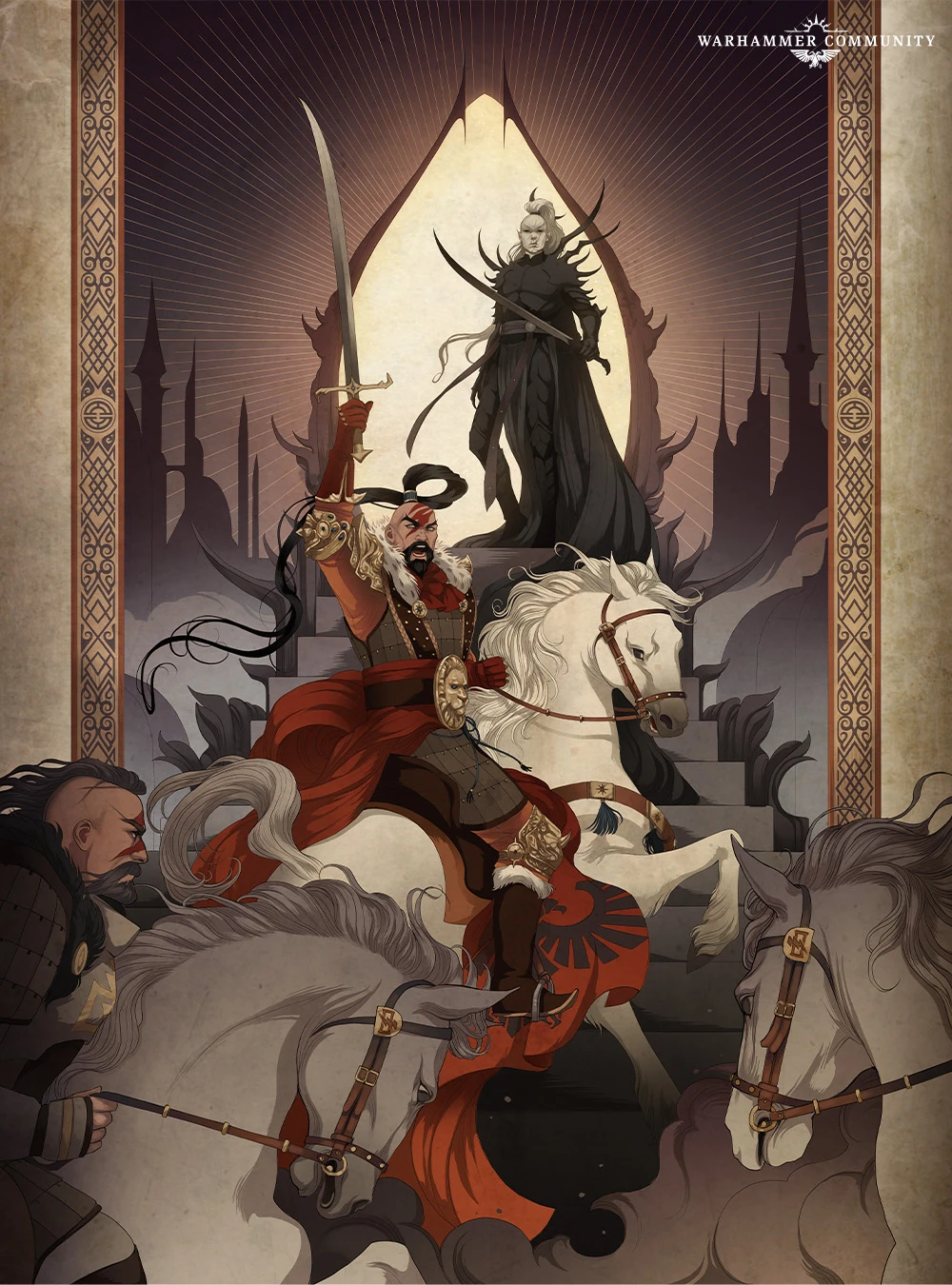 Jaghatai Khan in his youth conquering the world of Chogoris at the head of the Talaskar nomad confederacy; looming in the background is the Drukhari Webway portal through which the Khan would one day meet his final fate.
