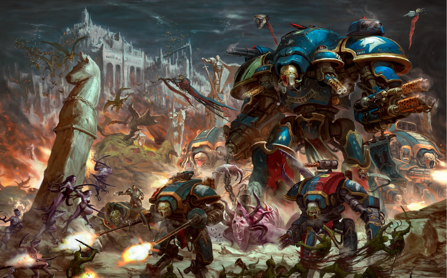 A Knight Valiant of House Terryn leading its smaller Imperial Knight brethren before the gates of Hive Halathor amidst the fury of the War of Reaping.