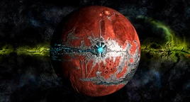 The Forge World of Konor and its moon the Forge World of Gantz, displaying the Manufactorum Gamma-Forvech (centre).