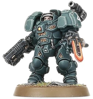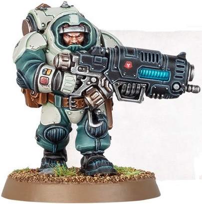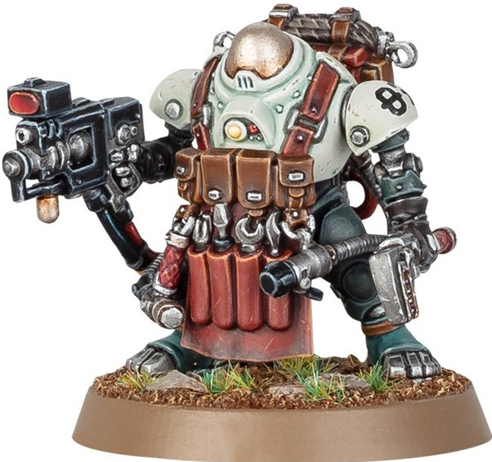 A Kin Hearthkyn trooper of the Leagues of Votann in his void armour suit and wielding an Etacarn Plasma Pistol.