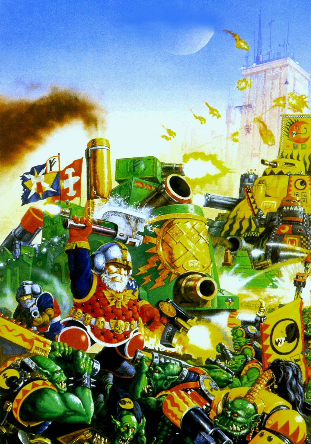 The Epic system brought with it an enduring enmity for the Squats with the Orks,** along with loads of machines and vehicles you could not find in the Imperium -- including gyrocopters, armoured dirigibles, land trains, and ludicrously massive siege weapons. And while they never produced Titans, ordnance like the Cyclops, the big green tank with the Gargant-killing cannon on its prow, was no less deadly.
