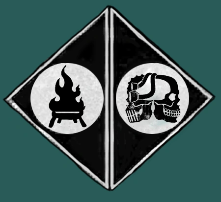 It consists of a black lozenge (diamond), outlined in white. On the left side, the symbol represents the Legio Vulcanum I (Dark Fire), which consists of a black brazier with dark fire burning from it. This symbol is centered within a white circlet.