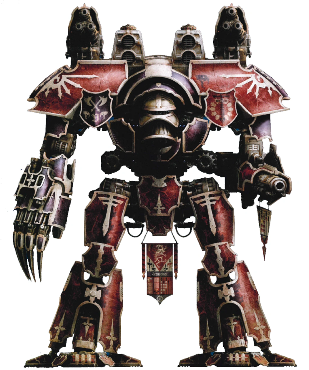 - Iconoclast (Warlord-class Titan) - Close combat weapons are rare on Titans as large as the Warlord-class, such as the one utilised by the Iconoclast depicted above, with most princeps adhering to the accepted wisdom of the Collegia Titanica that the proper role of the Warlord Titan is that of heavy ranged fire support. The Death Stalkers are among those who do not adhere to this school of thought, favouring close combat and weapons such as the Titan-grade Arioch Power Claw, that gives the wielder the strength to tear the plasma generator heart from another Titan in melee.