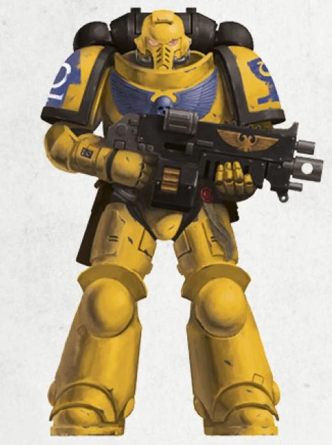 The Libators primarily wear yellow power armour. The Aquila or Imperialis on the chest plate is blue, while the power pack and shoulder plate trim are black.