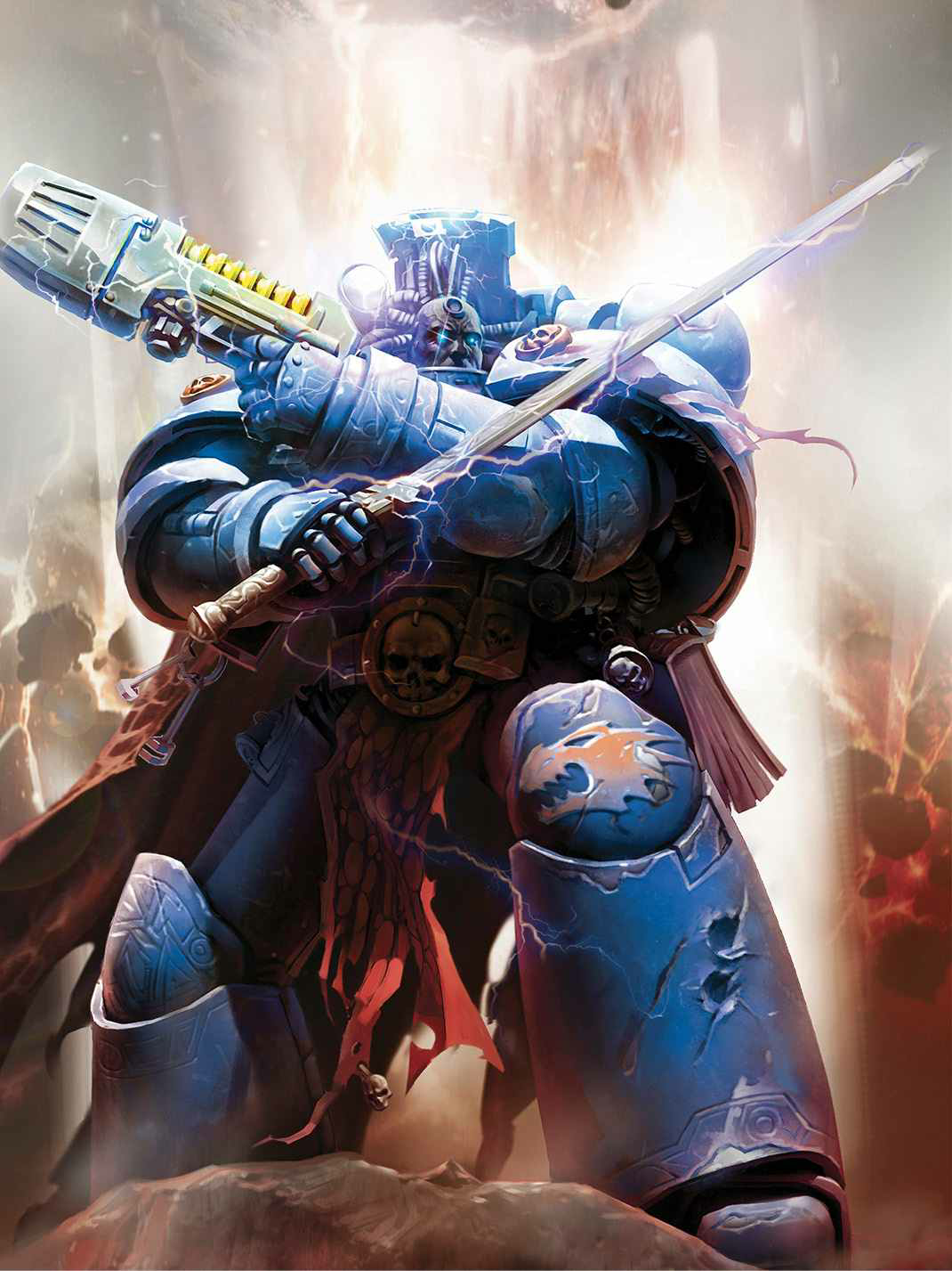 Like a storm cloud that presses down upon the world, the psychic shadow of the Librarian causes allies and enemies alike to look up as he enters the fray. Light streams from his eyes and sparks dance around his head, hinting at the intense energy of the Warp coiled within the weapon that is his mind. The true mastery of a Librarian is evinced when he utters his incantations. In a booming voice that reaches warriors even through the roaring din of combat, his words and thoughts become lightning, flame, and swirling vortexes that ravage the air with their fury.