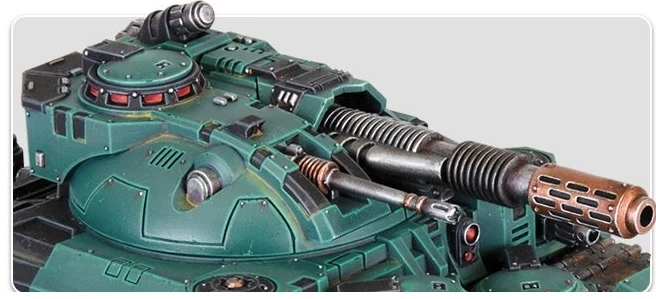A Melta Blast-gun deployed as the main turret weapon of a Sons of Horus Kratos Heavy Assault Tank.