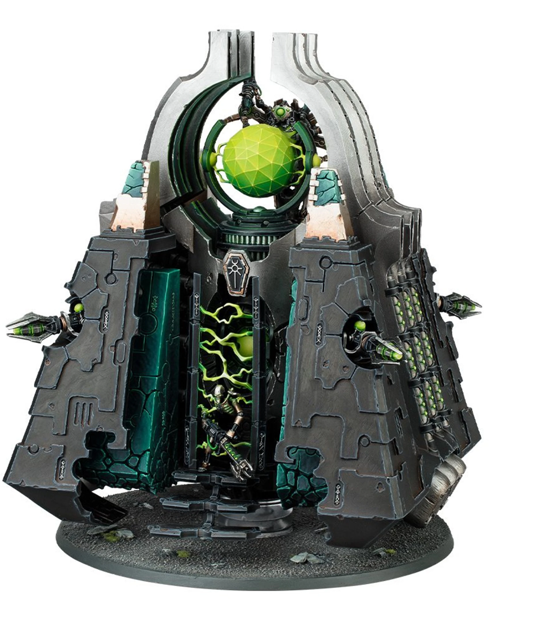 Nothing is more emblematic of Necron implacability than the Monolith. Like all Necron constructs, it is composed of the living metal necrodermis: a complex semi-sentient alloy that ripples and flows and adapts its structure to repair damage in the blink of an eye.