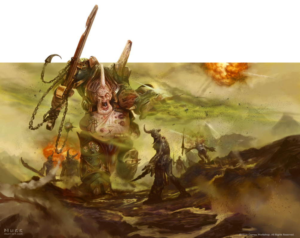 Relatively few of those who receive Nurgle's glorious blessings distinguish themselves as much more than a tiny but welcome maggot, doing their part to eat away at the rotting corpse that is the decaying universe. Those who do differentiate themselves invariably exemplify the precepts of Nurgle's philosophy and emulate his grand and corrupted form at a level that leaves no doubt as to which of the Ruinous Powers has claimed their souls. These are the Plaguefather's mortal champions, and it is through their foul deeds that many of the greatest accomplishments of Nurgle's plan for the Great Corruption are achieved.