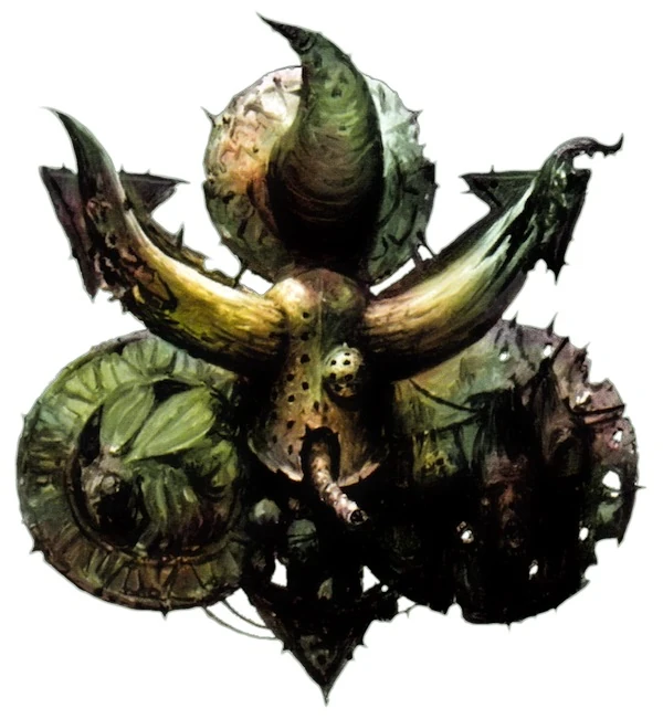 - Great Unclean One - A Great Unclean One is a grotesquely corpulent Greater Daemon of the Plague God Nurgle, the Chaos God of disease, death and decay. These loathsome Daemons are the harbingers of the lord of rot and ruin, and amongst Grandfather Nurgle's greatest servants, bearers of his most sacred plagues and poxes. Their forms are squat and mountainous, covered in rotting flesh and open sores that weep foul rivulets of pus. Hot ropes of intestines dribble out of huge tears in their enormous, bloated and distended bellies. This horrific girth is supported by two impossibly small and atrophied-looking legs, and their inordinately large, bulbous heads are crowned by enormous stag-like antlers. To the mortal eye, a Greater Daemon of Nurgle is undoubtedly the foulest of all the Daemonic servants of the Ruinous Powers. Each of these Great Unclean Ones is shaped in the fashion of Nurgle himself; flyblown, maggot-ridden innards spill into view through the tears and gashes in his swollen belly as he lumbers forwards. Clusters of pustules and weeping buboes erupt from his hide, birthing small swarms of giggling Nurglings. Noxious juices seep from dozens of infected sores, leaving a glistening trail of mucus in the Great Unclean One's wake. Few mortals have the stomach, let alone the will, to oppose such a being. Great Unclean Ones are Nurgle's lieutenants, the field generals of his Plague Legions. As monstrous and horrific as their appearance is, these Greater Daemons are possessed of a paternal affection at odds with this nightmarish form. Gregarious and sentimental, a Great Unclean One takes pride in the achievements of his followers and looks upon all the creatures in his legion as his "children," and his underlings look upon him as an embodiment of Grandfather Nurgle. Each Greater Daemon pays careful attention to all of his followers, and is noticeably proud of their appearance and endearing behaviour. A Great Unclean One takes delight in his minions' smallest boils, revelling in the variety and effulgence of their poxes and heaping praise upon them with vociferous proclamations. With a wave of his arms such a monstrosity sends forth his Tallybands, booming words of encouragement and gurgling guffaws across the battlefield. This boundless energy and drive is possessed by all Great Unclean Ones; constantly working to extend the process of rot and decay, they are heedless of their own comfort while parts of the galaxy still remain untouched by Nurgle's bounty.