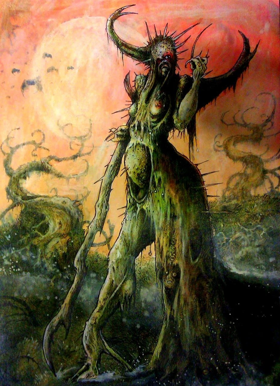 No matter if they sought his gifts or if they themselves were found, the exchange is never quite what was expected. These mortals have their doubts and fears cast aside. They find that they are no longer caught in the paralysing grip of despair and misery. Their afflictions, however, linger, and are usually joined by other blights. New sores and pustules appear, the foul liquids they contain becoming home to small worms and maggots. Bellies swell and distend, the flesh straining to contain bleeding entrails that push the abdomen outward. Old wounds rip open again spontaneously and invite fresh infections. Whatever diseases or weakness these mortals once sought to leave behind take up permanent residence within their bodies and minds.