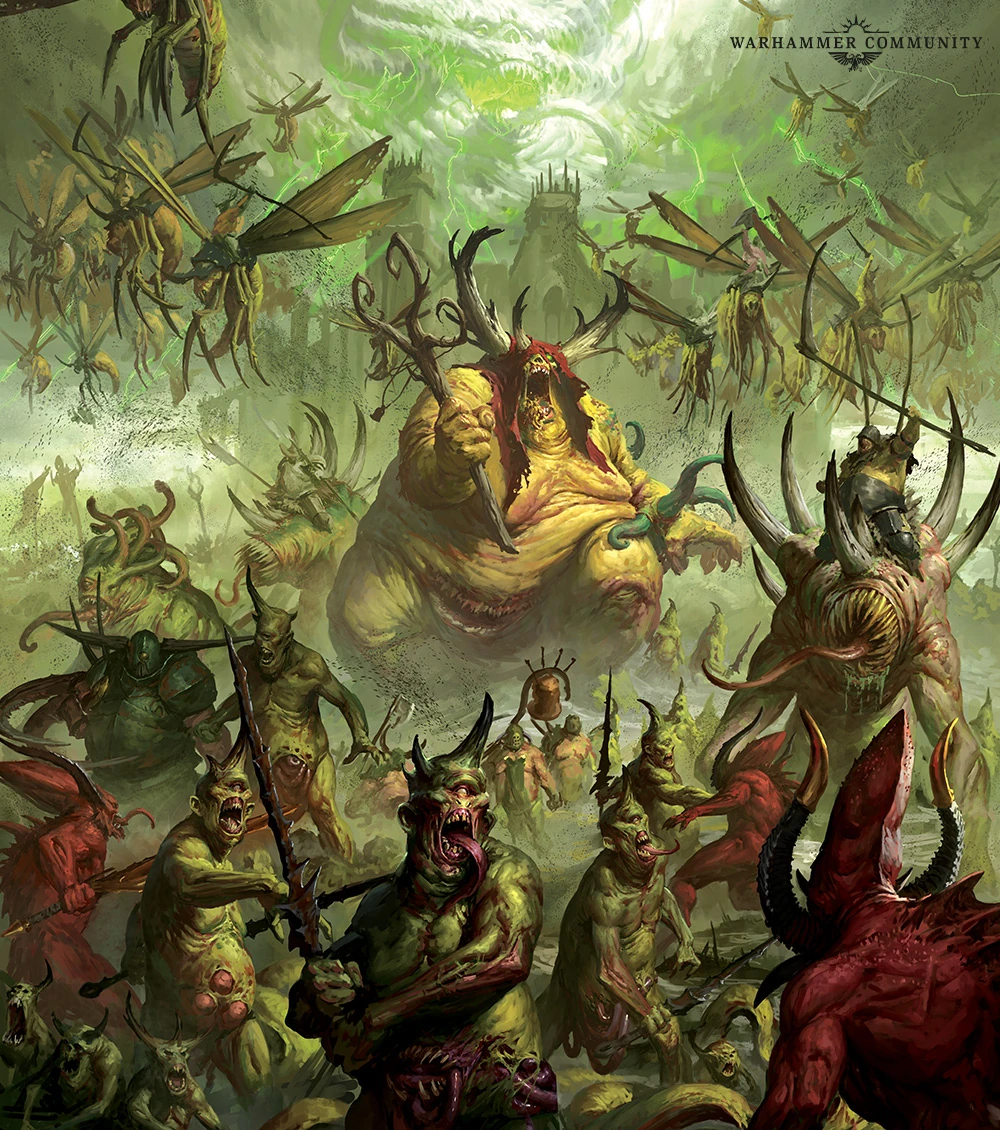 The Rot Legions revel in decay, their festering powers and potent blessings able to break down anything; more than any other Daemonic legion, their presence cultivates the ground for the Garden of Nurgle to spread.