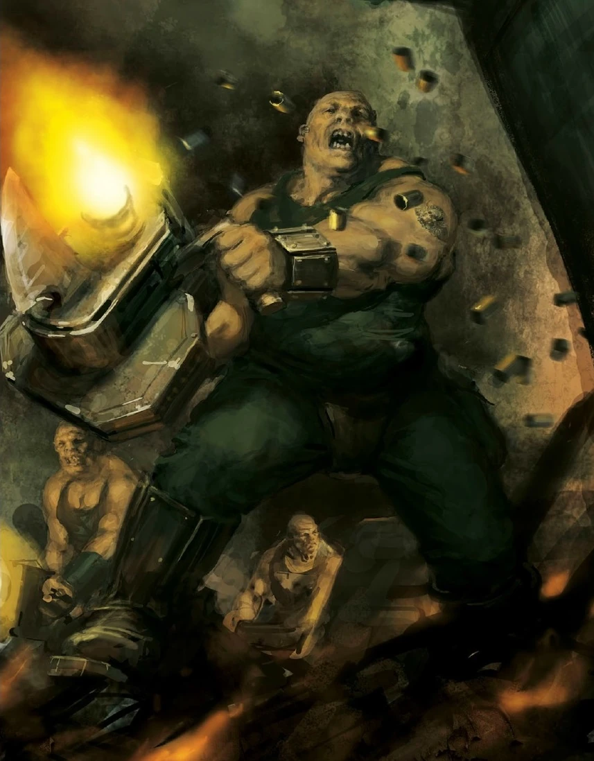 Their skin is extremely thick and Ogryns can ignore wounds that would cripple or kill a normal man. As they are brutal and direct, they favour knuckle dusters and knives for close combat. Ogryns in Imperial service are issued with special, large auto-shotguns known as Ripper Guns for ranged combat and clubbing at melee. The use of Frag Grenades is also popular among Ogryns.