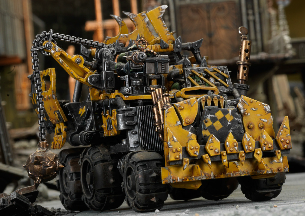 Orks tend toward light, fast vehicles with big guns that can be cobbled together from any junk to hand. Most are crewed by a mad-eyed Ork driver and cackling gunner, with perhaps a Grot or two hanging on for dear life. What they lack in survivability, these crude vehicles make up for in speed, numbers and dakka. They encircle the enemy in speeding squadrons, guns blazing wildly while their crew throw their heads back and howl like Madboyz. Most consist of little more than chassis, engine, gubbins and a sizeable gun, and are capable of an impressive turn of speed. For traversing dense terrain, some Warbuggies will be converted into the half-track Wartrakks, while the addition of a jutting flamethrower, some sloshing fuel tanks and a crew of slavering Burna Boyz transforms a Warbuggy into the much feared Skorcha.