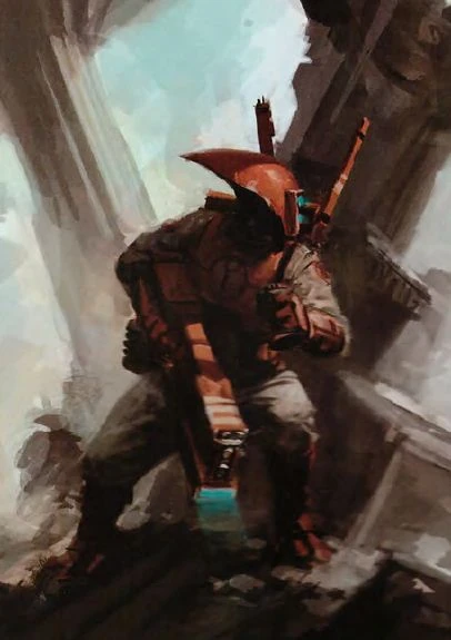 A Pathfinder's role is not to engage the enemy, but instead to maximise the efficiency of the rest of their Hunter Cadre with their Marker Lights which designate priority enemy targets and guide the fire of their comrades.