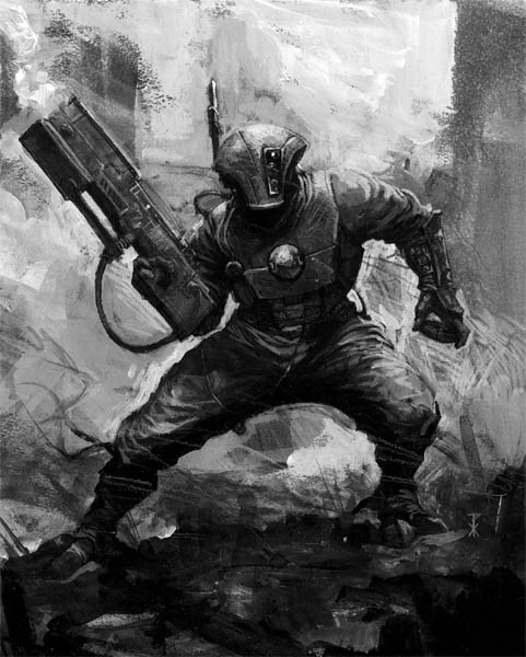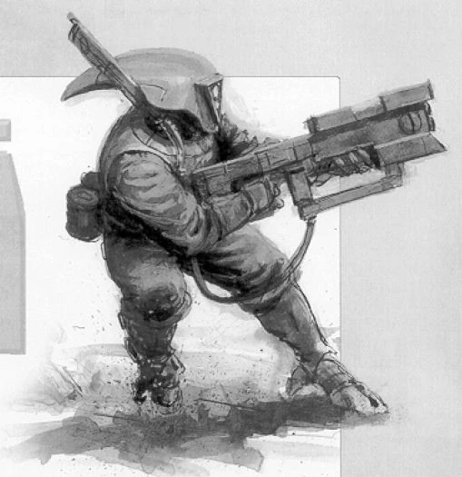 A Pathfinder's standard kit includes a Pulse Carbine fitted with an underslung Photon Grenade Launcher as their primary weapon -- ideal for the close-ranged firefights they so frequently find themselves engaged in. The blinding, disorienting effect of the Photon Grenades is utilised by the Pathfinders when reacting to sudden and unanticipated contact with the enemy.