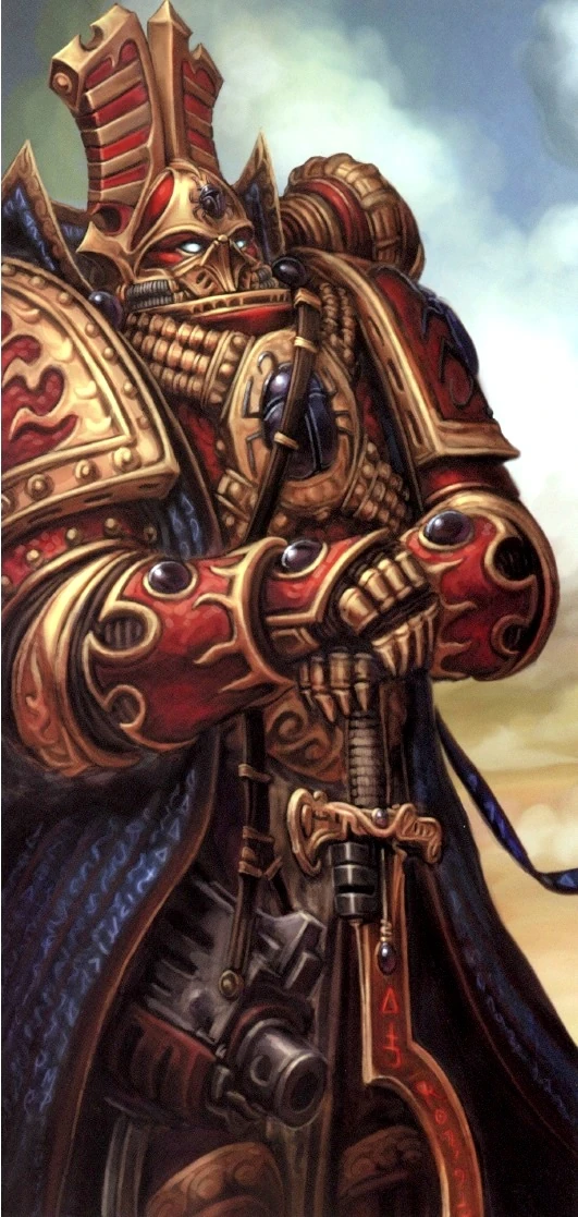 When faced by the null-maidens of the Sisters of Silence, T'Kar quickly realised the psychic dampening affect they had upon his Battle-Brothers and the overall tide of the battle. T'Kar switched tactics, relying on his training as an Astartes and utilising his Bolter in a sniper capacity. He then had his Tutelary Utipa deploy as his invisible spotter, which enabled T'Kar to take out several null maidens with multiple well-placed, long-range Bolter shots. With the psychic Blanks dead, the Thousand Sons within T'Kar's vicinity were able to fight with clinical detachment, every warrior having achieved the lower Enumerations to better focus their skills. This only offered a temporary reprieve, for soon the enormous majesty of the Wolf King and a coterie of gold-armoured Custodes giants led by their commander Constantin Valdor, strode through the battle lines towards them. The Thousand Sons soon fell back towards the Pyramid of Photep, their last refuge on Tizca. The best and bravest of the Legion, all that survived to sell their lives in sight of their Primarch, went with their First Captain towards the bronze gates that led inside.