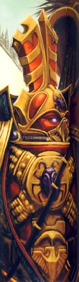 Establishing a beachhead in the spaceport area, the Space Wolves began slaughtering thousands of Prosperines, burning everything in sight. Yet the Thousand Sons' rank-and-file did not share Magnus' acceptance of defeat and punishment, so they took up arms against the Loyalist invaders. T'Kar was one of the first of the XV Legion's Fellowship Captains to advocate fighting back against the invading Space Wolves, despite their Primarch's pleas to accept their fate. When Ahzek Ahriman assumed command of the XV Legion in the Primarch's absence, he proposed a plan of fierce resistance to those that would dare invade their homeworld. T'Kar immediately offered his support to the First Captain. The Thousand Sons managed to hold Tizca (the only surviving city on the planet) for a period of time before they were eventually pushed back. Among the warriors of Fenris were warriors in gold and red. They carried long spears with ebony hafts and shimmering blades. Phosis T'Kar grinned at the thought of matching his strength against the warriors of the Legio Custodes, but over the course of the battle, he became vaguely disgusted that the Custodians were not particularly difficult to kill. Phosis T'Kar laughed to see his Legion unleashed, with no constraints to its full potential and no faint-hearts complaining because they could kill the enemies of the Imperium better than anyone else with their psychic powers.