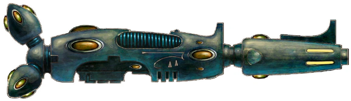 - Omega Pattern Plasma Blastgun – The Omega Pattern Plasma Blastgun, although available since its discovery in the late 39th Millennium by Explorator Magos Valistle Hum'nal, suffered doctrinal wranglings over the purity and completeness of its template within the Adeptus Mechanicus. This would delay its field testing and eventual deployment for centuries. The weapon's design, although more widely applicable that the arcane technologies of its forbearer -- the standard Plasma Blastgun-- lacks the stability of the superlative Ryza Pattern weapon more commonly deployed on Titans and Stormblades, and generates considerably more waste heat. However, the Omega Pattern also utilises a more compact generator design and force crucible, allowing it to be mounted on smaller super-heavy hulls such as the Macharius Omega Heavy Tank. An Omega Pattern Plasma Blastgun is capable of firing in two main modes, both of which are capable of throwing out huge toroids of plasma that are far larger than the bolts fired by the more common Plasma Cannons. The first mode is a pulsed mode which trades strength for rate of fire, whilst the second maximal mode generates a single devastating blast capable of felling anything short of a Titan. However, due to the weapon’s smaller size, an Omega Pattern Blastgun cannot fire blasts with quite the same large scale as those fired by a standard Plasma Blastgun.