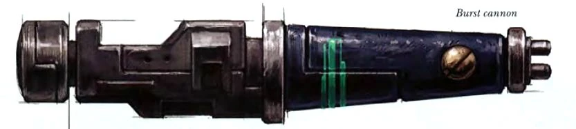- Burst Cannon – Multi-barreled weapons capable of sustaining very high rates of fire, Burst Cannons are an offshoot of T'au Pulse Weapon technology. They are usually mounted on Tau Battlesuits and vehicles, providing heavy anti-infantry support. Burst Cannons have four barrels and are short-ranged, like Pulse Carbines, though this is deficiency is offset by the maneuverability of the T'au units commonly armed with them. Long-barrelled Burst Cannons are variants of standard Burst Cannons usually mounted on T'au aircraft, and possess almost double the range due to their extended barrel lengths.