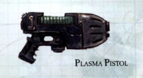 - Plasma Pistol – Perhaps the most destructive sidearm in common use in the Imperium, a soldier with a Plasma Pistol wields the power of a small sun in his hands. Plasma Pistols are the smallest variant in the Imperial Plasma Weapon family, and their small and compact design allows them to be wielded in a single hand. They are most commonly paired with a close-combat weapon of some form. Each shot from a Plasma Pistol leaves the destructive fury of larger Plasma Guns undiminished in a smaller package, although its diminished size means it must sacrifice range and rate of fire. Those willing to take the risk of using one possess a weapon capable of taking down almost any foe at close range. Plasma Pistols are a favourite of Imperial officers, who view it as a status symbol to be entrusted with such a valuable and venerated weapon. Few pistols are deadlier than a Plasma Pistol, and even many ranking Adeptus Astartes find them worth the trouble of acquiring and the risk of their use acceptable as a result of their sheer efficiency in eliminating foes at close range. However, Plasma Pistols hold smaller hydrogen flasks than larger Plasma Weapons and can thus only fire a handful of shots. They are dangerous to use on board voidships as a single shot can penetrate several bulkheads. Plasma Pistols most commonly have two modes of fire -- a standard mode, and a maximal mode which uses more fuel in a single shot for additional stopping power. However, the user must wait a short time whilst the weapon recharges and replenishes its internal fuel reserves when using the latter setting.