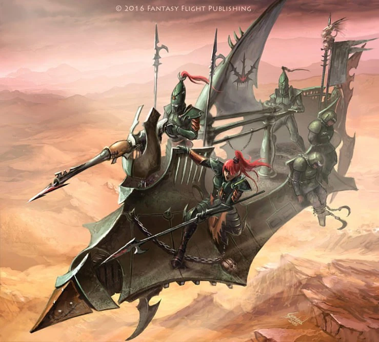 Though each of these transports is customised by the Kabal that owns it and is adorned with the severed body parts of past victims, all have certain basic features in common, including a repulsor keelblade manned by a talented steersman, Aethersails to harness the multidimensional shear energies that flow from the Webway portal from which they emerge, and a prow-mounted heavy weapon, usually a Dark Lance, to sow slaughter amongst the unexpecting enemy.