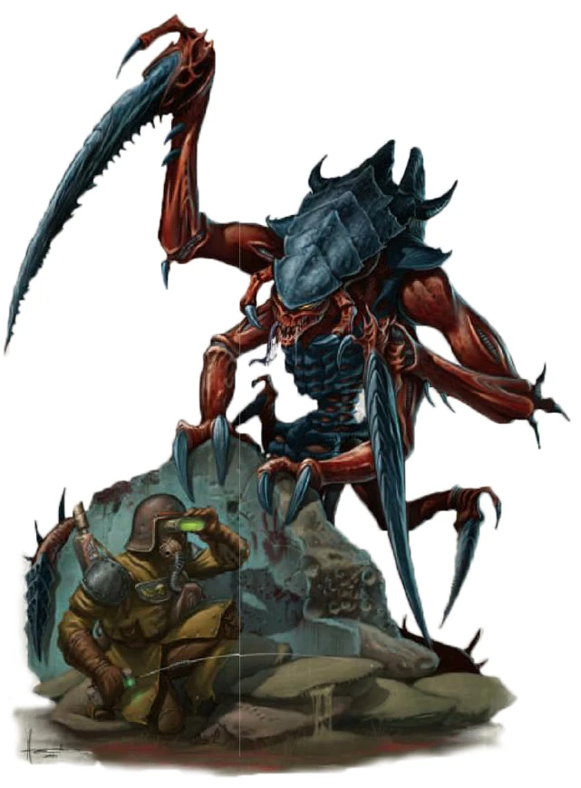Imperial Magi Biologis researchers believe that the Ravener is a variant of the Tyranid Warrior genus. The same savants hold that other Tyranid creatures, such as the Trygon or Haruspex, may in turn descend from the Ravener genus.
