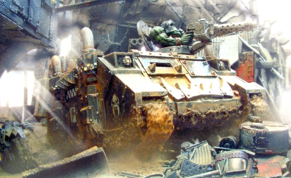 The Orks are masters of salvage and they are capable of turning a completely destroyed tank or other vehicle into a functioning heap of metal and weapons within only days of beginning work on such a hulk. The Rhino is a particularly favoured vehicle that many Ork Mekboyz and Lootas like to target.