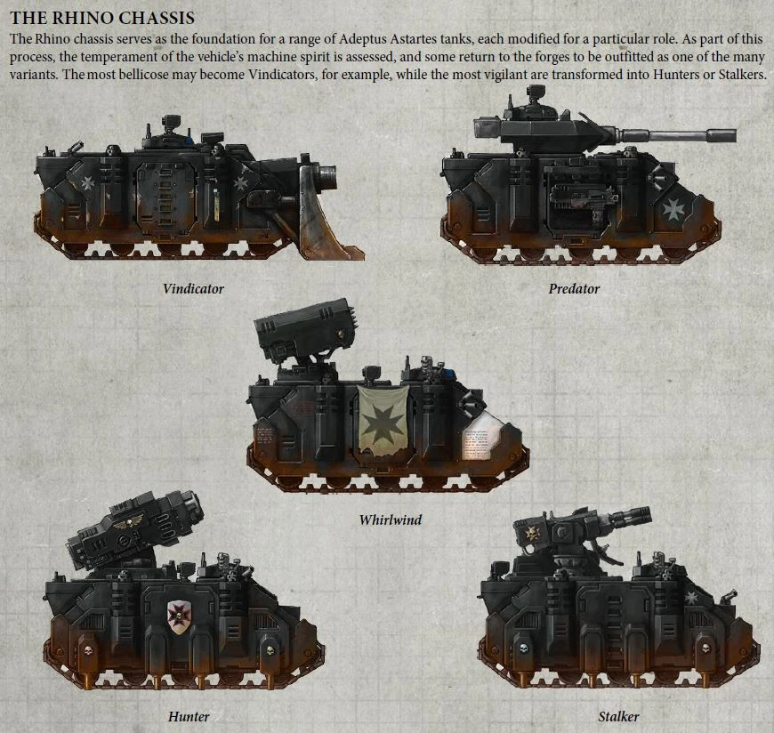 In time, the vehicle became the standard fighting vehicle of human armed forces across the galaxy. Recovered STC databases provided the early Imperial armies with Rhino variants still in use today, such as the Predator, Immolator and Whirlwind. There are many other variants, now lost to the depths of time only awaiting rediscovery.