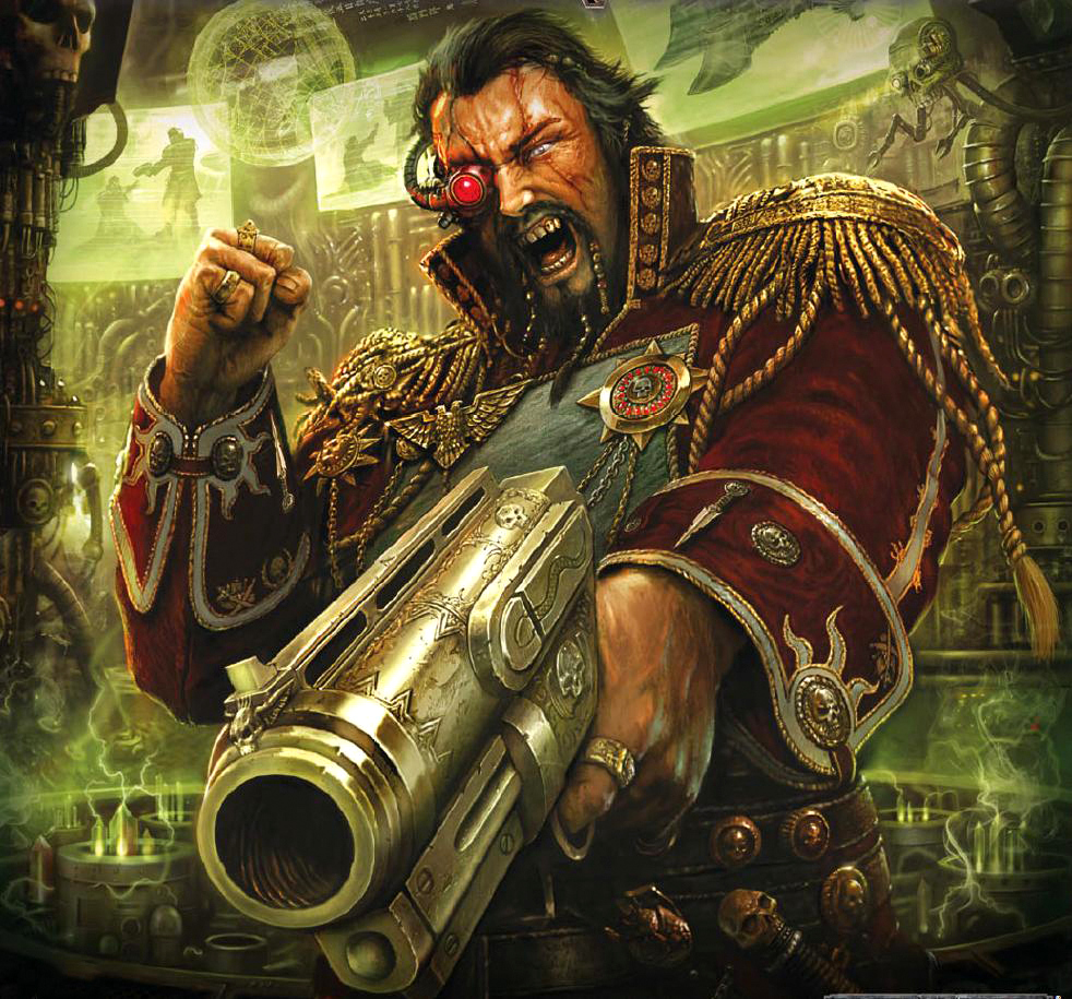 In appearance, these militant Rogue Traders vary hugely. Many wear the trappings of the regiment from which they were originally drawn, which, unlike the formalised uniforms of the Imperial Navy, is often specific to the culture of the regimental homeworld. They may also wear elements of the uniforms of the Imperial General Staff, including a long, elaborate coat, or peaked cap. The many who prefer to lead their conquests from the frontline mix such dress in a manner more appropriate to their warrior background, combining a dress uniform with Carapace Armour or even power armour modified to fit a normal-sized Human.
