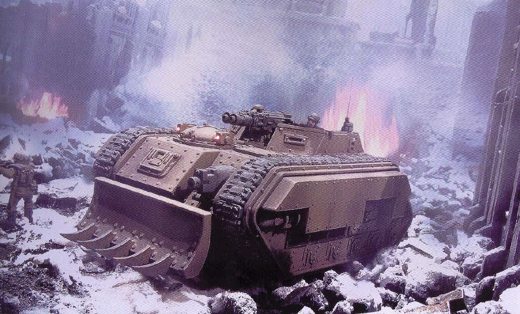 The Heavy Flamer can be replaced with another Heavy Bolter, giving the vehicle better medium-ranged firepower. Both variants can be outfitted with the following enhancements; Camouflage Netting, Extra Armour Plating, a Hunter-Killer Missile Launcher, improved communications equipment, a mine sweeper, a Dozer Blade, rough terrain modifications, a Pintle-mounted Heavy Stubber or Storm Bolter, track guards, a Searchlight, and Smoke Launchers.