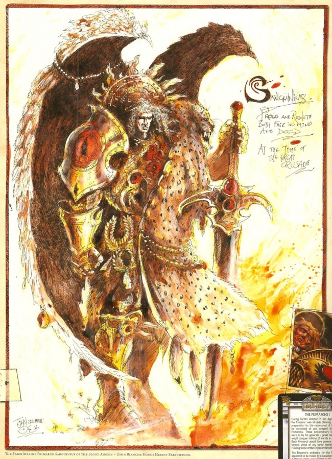 Sanguinius, also known as the "Great Angel" and the "Brightest One" during his lifetime, was the primarch of the Blood Angels Legion of Space Marines and the genetic ancestor of the Adeptus Astartes Chapters who comprise the Sanguinary Brotherhood in the 41st Millennium.