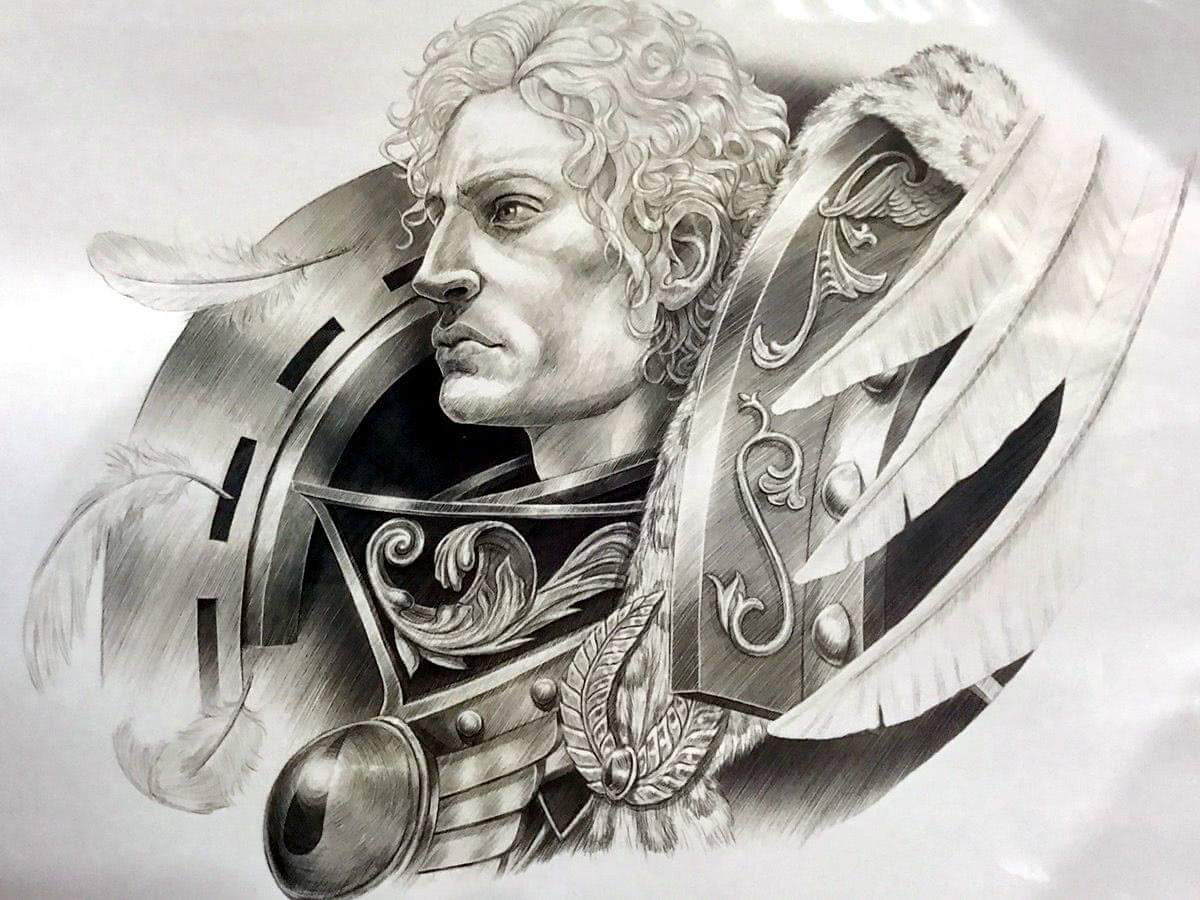An ancient Remembrancer sketch from Carpinus' Speculum Historiale of the Primarch Sanguinius during the Great Crusade.