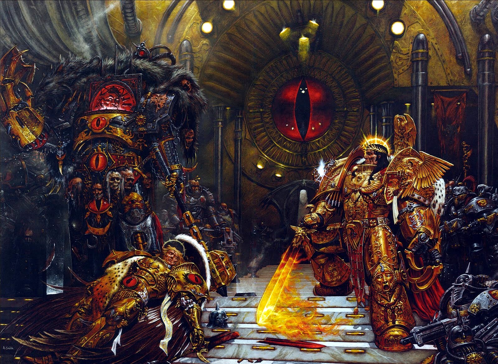 Having long planned for exactly this moment due to his prescient vision, the Emperor teleported aboard the hellish craft, Sanguinius and Rogal Dorn and a contingent from the Imperial Fists, the Blood Angels and the Legio Custodes close behind him.
