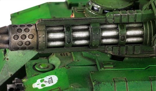 A close-up view of the Sicaran Punisher's Punisher Rotary Cannon's multiple barrels.