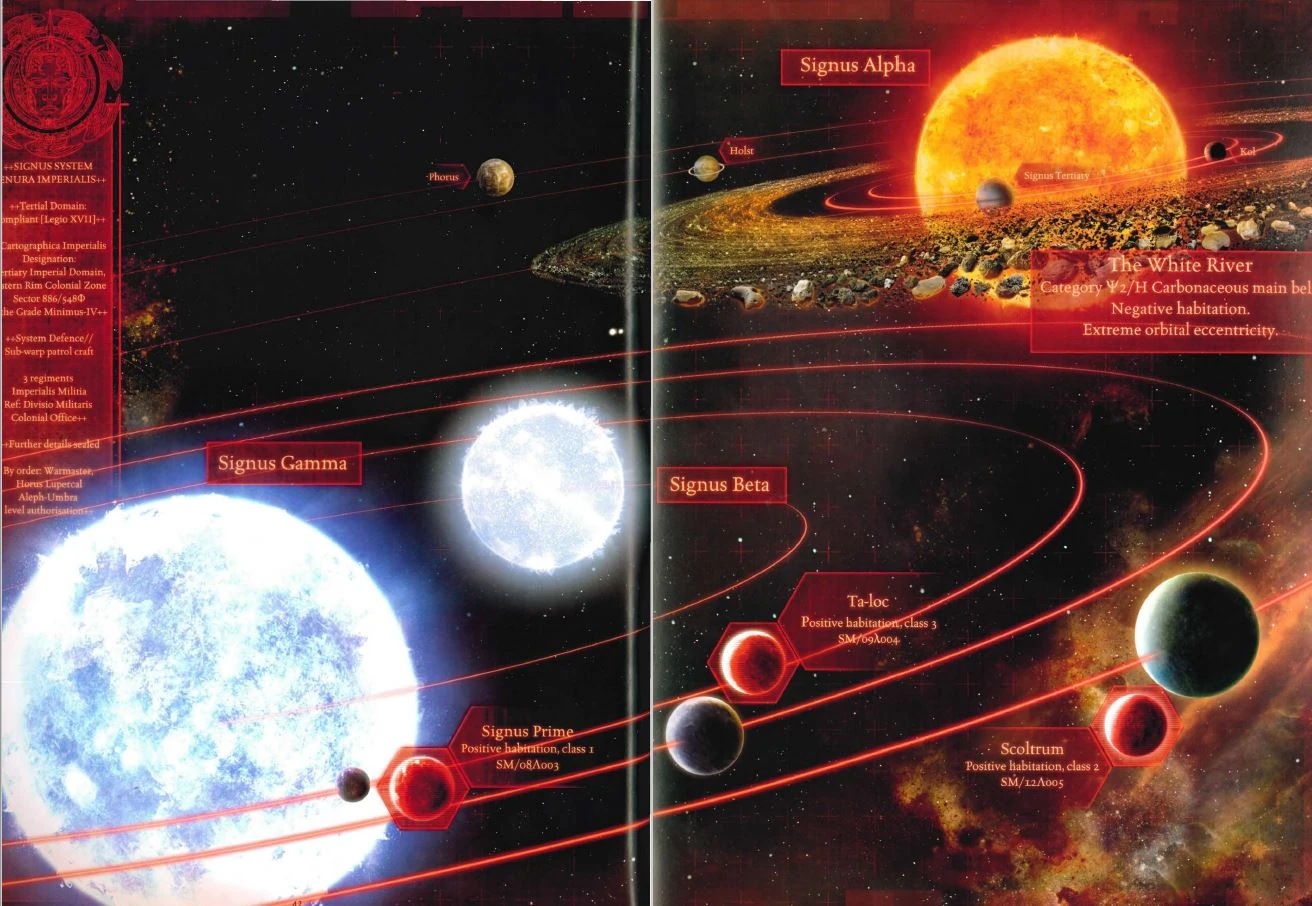 A map of the Signus System, called the Signus Cluster, at the time of the Signus Campaign early in the Horus Heresy.