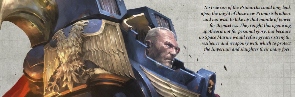 However a man becomes a Space Marine does not matter: once his body has been forged into that of a transhuman Astartes, he must forever stand apart from the people to whom he was once kin and who he is now sworn to protect. Once a man becomes a Space Marine, he is no longer mortal; his genetic heritage is now that of the Emperor Himself, and a spark of the same divine majesty flows in his veins.