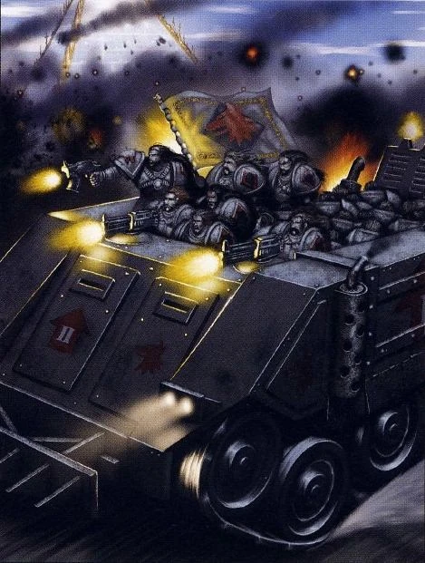 In terms of equipment, the warriors of a 13th Great Company warband fight, and travel, light. They have never been observed to use transports of any type. It is of course entirely possible that the 13th Company were never issued any vehicles in the first place, as their superior infiltration skills would make the use of frontline vehicles undesirable and unnecessary. The equipment carried by the company appears basic, and even debased compared to a conventional Space Wolves force.