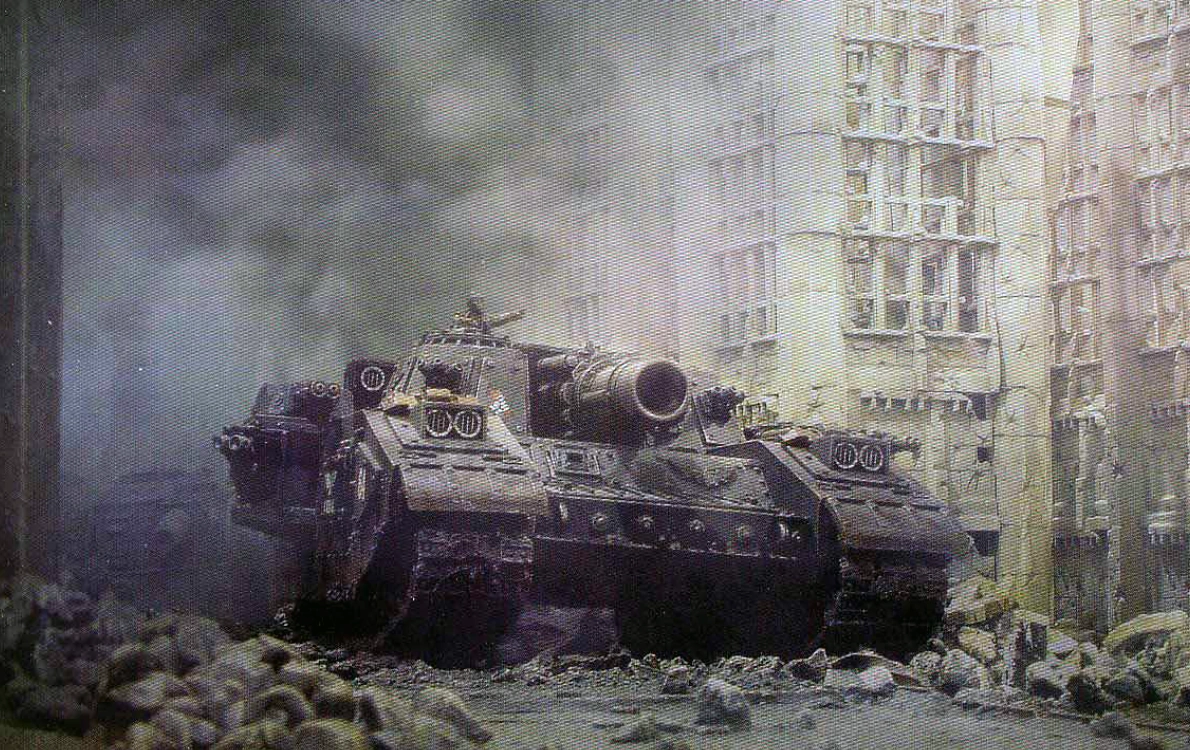 In the chaos of urban warfare, where range is often measured in metres and progress in the form of single buildings captured or destroyed, neither the relative short range of its armament, nor its poor speed and manoeuvrability hampers the Stormsword when delivering fiery devastation upon the enemies of Mankind. When assaulting a city, the Stormsword will spearhead the attack, blasting any fortified strongpoint to rubble, covering the advancing infantry with its secondary weaponry and motivating them with its very presence. Of all the close support tanks in the Imperium of Man's arsenal, the Stormsword is the most brutally effective.