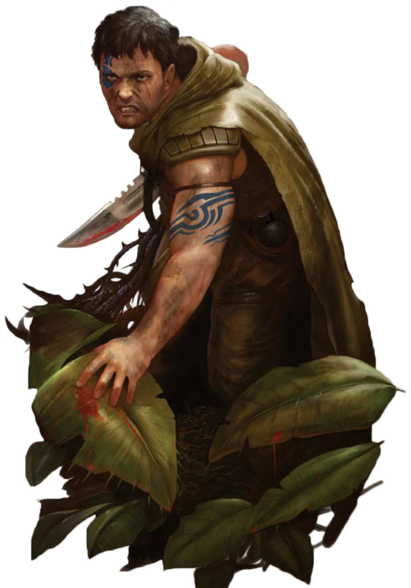 The native-born Tanith can be generally identified by their pale skin, which contrasts with their dark hair and blue tattoos. Virtually every Tanith possesses a visible tattoo, although the number, design, size, and complexity varies wildly between individuals. They come from a wide variety of backgrounds, as one would expect from a regiment drawn from the entirety of a Forest World. They share exceptional abilities at stealth, as a standard Ghost matches or exceeds a scout specialist from any other regiment.