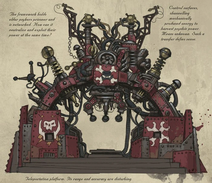 A stationary Tellyporta Platform developed by Ork Mekboyz which is capable of transferring mechanically-generated power into psychic energy to teleport users through the Immaterium. How this is done defies all Imperial understanding of how technology is supposed to work.