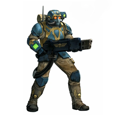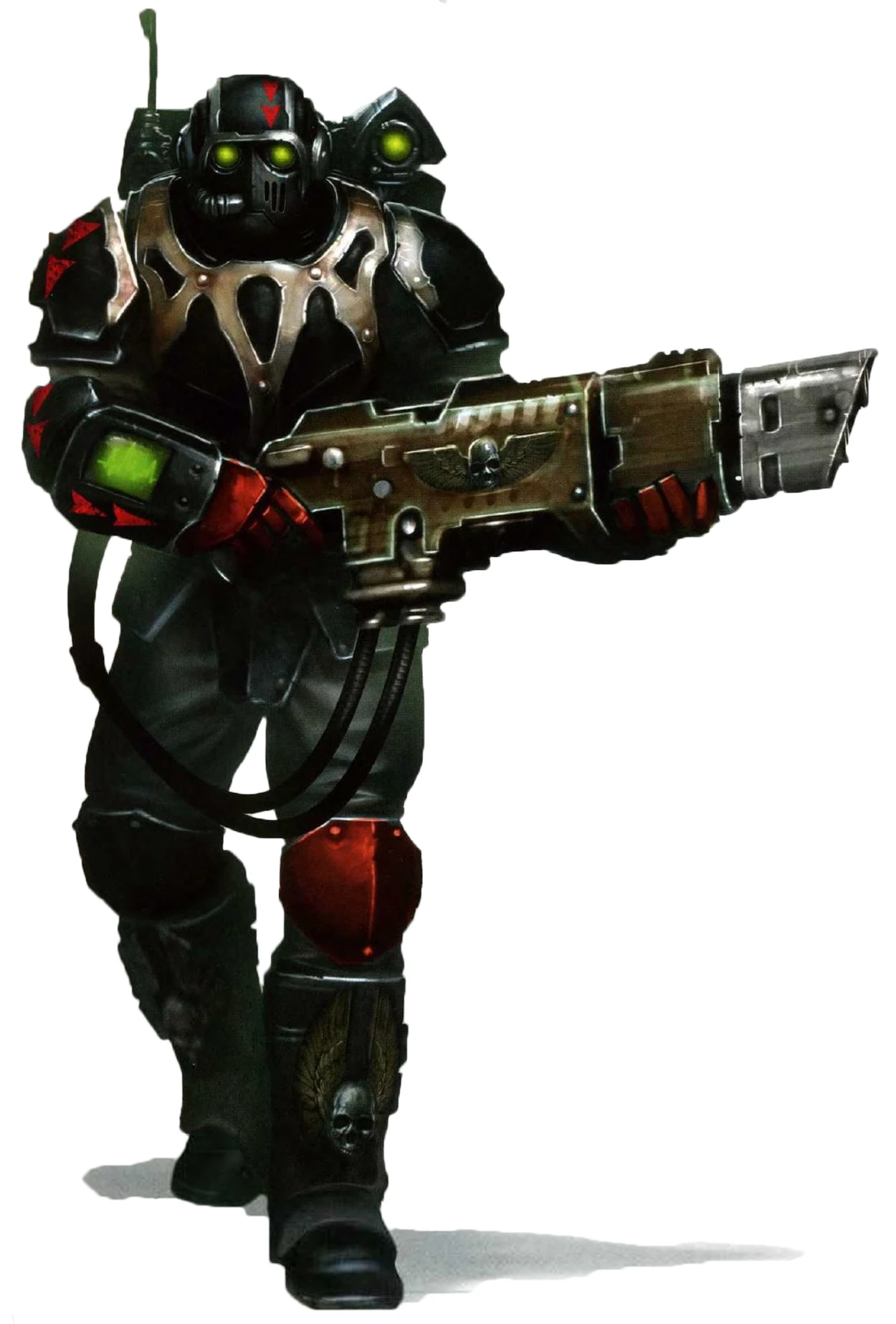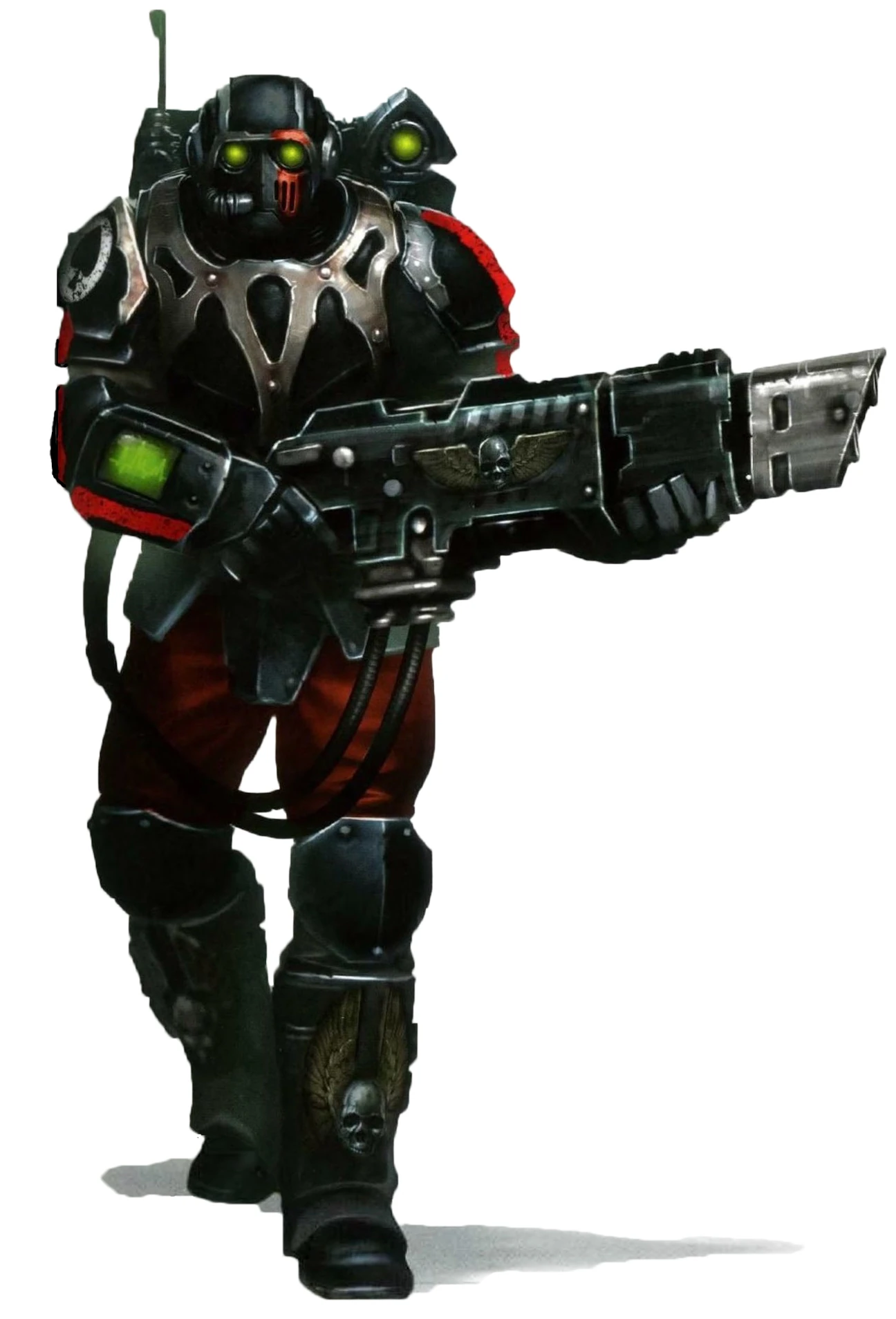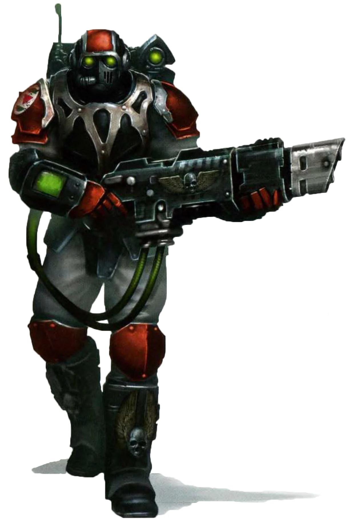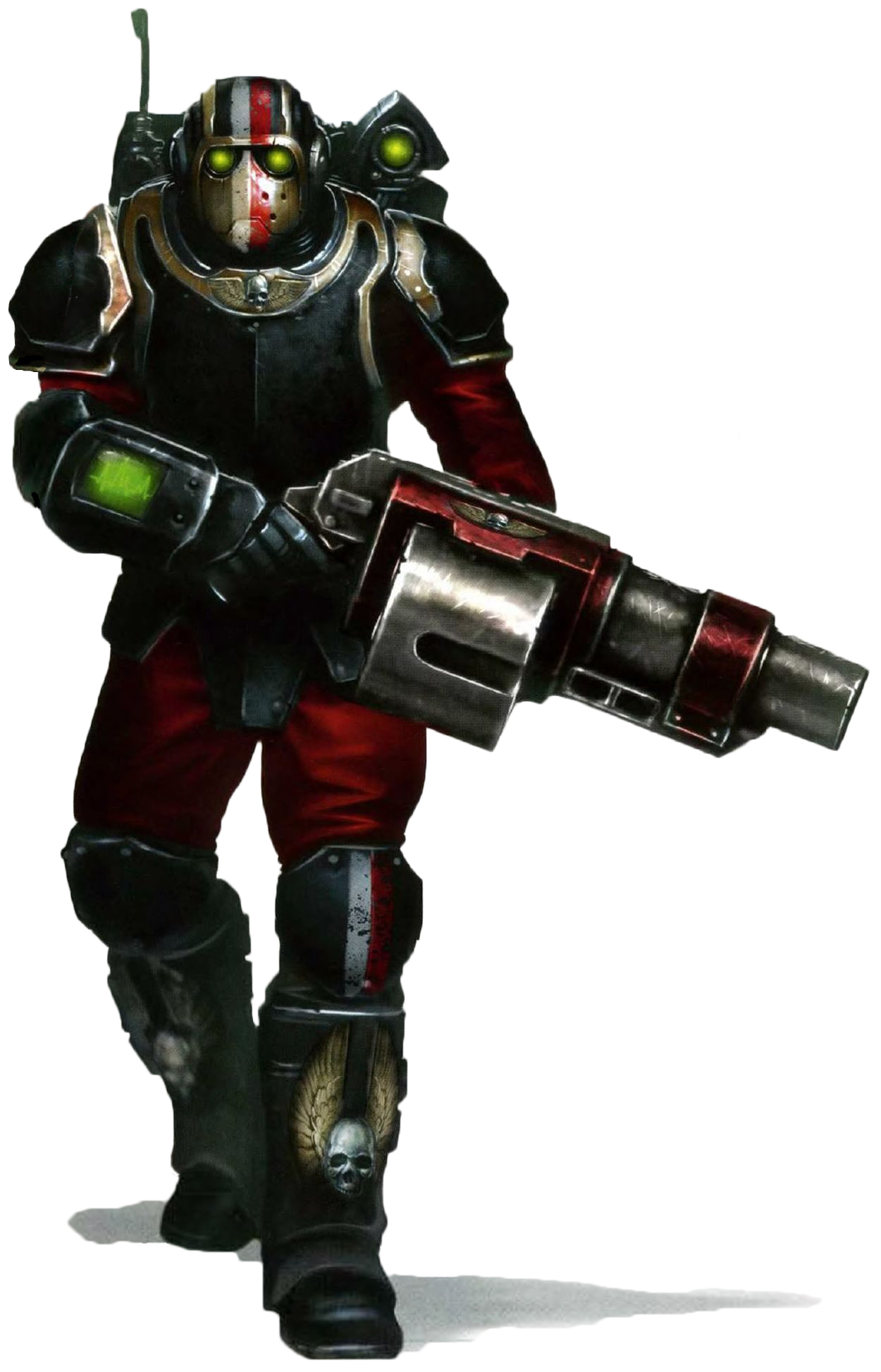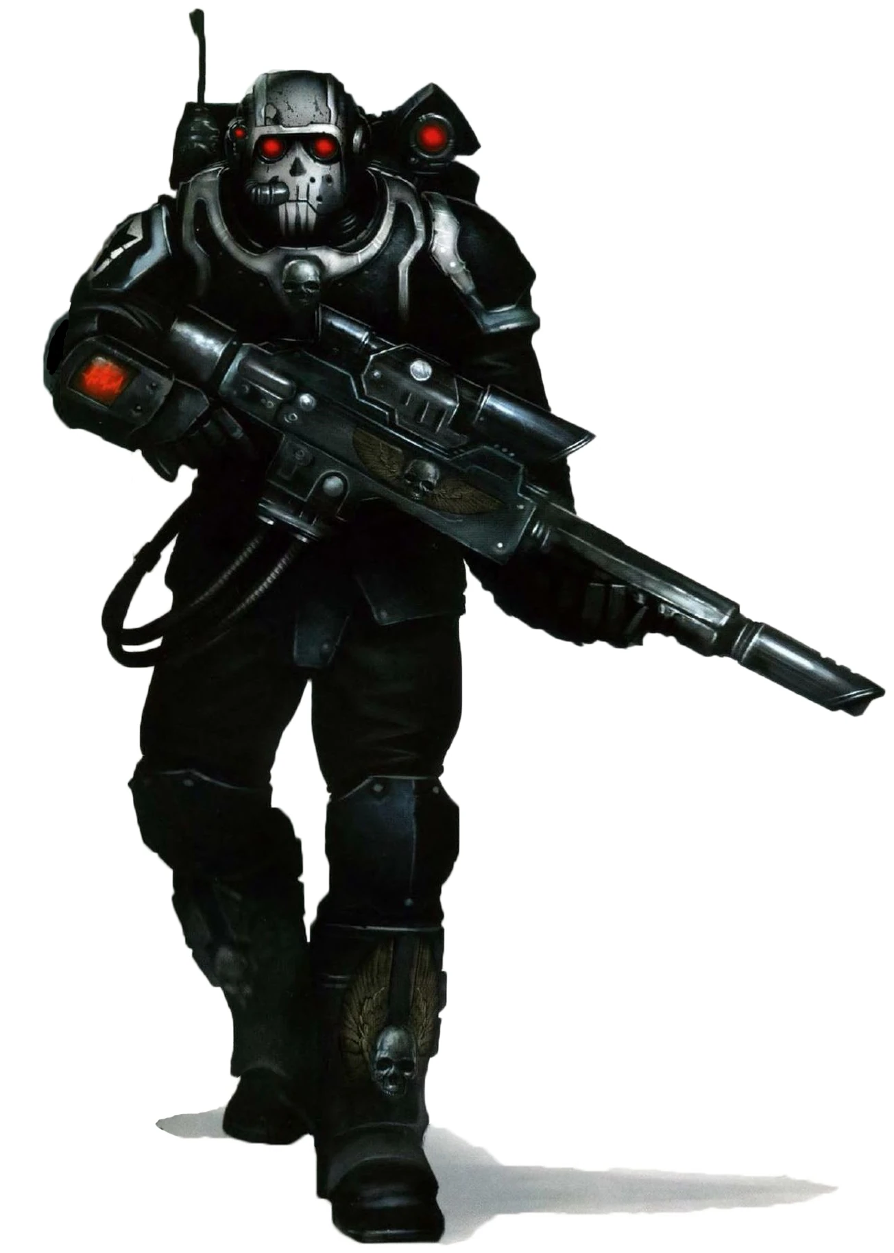 They are trained and equipped in a manner similar to standard Militarum Tempestus Storm Troopers, albeit lacking the rapid insertion and infiltration skills, as they are not expected to undertake such types of missions. Such activities are more often carried out for the Inquisition by the Officio Assassinorum.