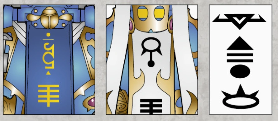 The complex geometric symbols once worn by the seers and scholars of Tizca live on in the iconography of the Thousand Sons. Each sigil has many potential meanings; though their forms remain the same as the original rune, the intent behind them has changed. For instance, a fire-symbol that was once borne to represent "Sunrise" would now be interpreted as the "Killing Flame."