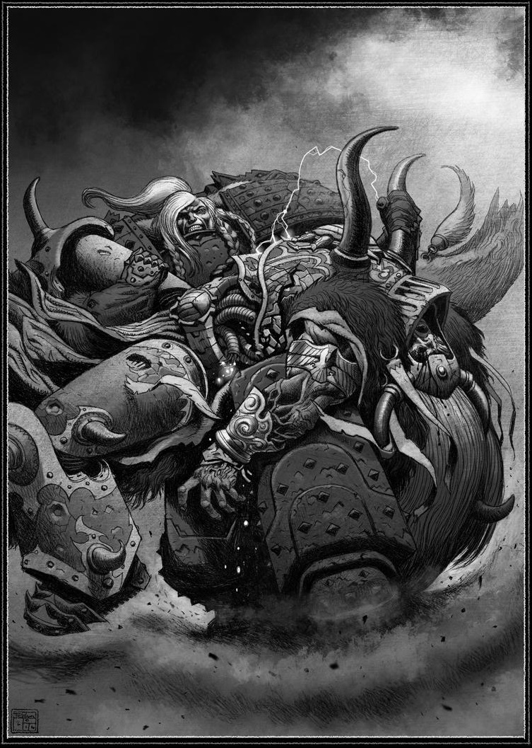 The Wolf King walked calmly towards his brother Primarch, as both sides readied themselves to make war upon one another. Total war between the two Legions seemed imminent. Fortunately, disaster was just barely averted when Primarch Lorgar interposed himself between his brothers, and through his masterful oratory, managed to calm the tense situation. Magnus refused to stand by as the Wolves ravaged Heliosa. But Russ retorted that this world was discovered by his Legion, and therefore, it was his to do with as he saw fit. The people of this world had chosen to fight the Imperium, and therefore had chosen death. As the Wolf King departed, he turned to face Magnus once more, and swore a blood oath against the Crimson King, promising that one day soon, there would be a reckoning between both of them. The Wolf King then slashed his blade across his palm, and let his blood spill to the ground. He then threw his head back and howled, and his warriors added their voices to their master's cry -- a lament for the dead and grim warning of things to come.