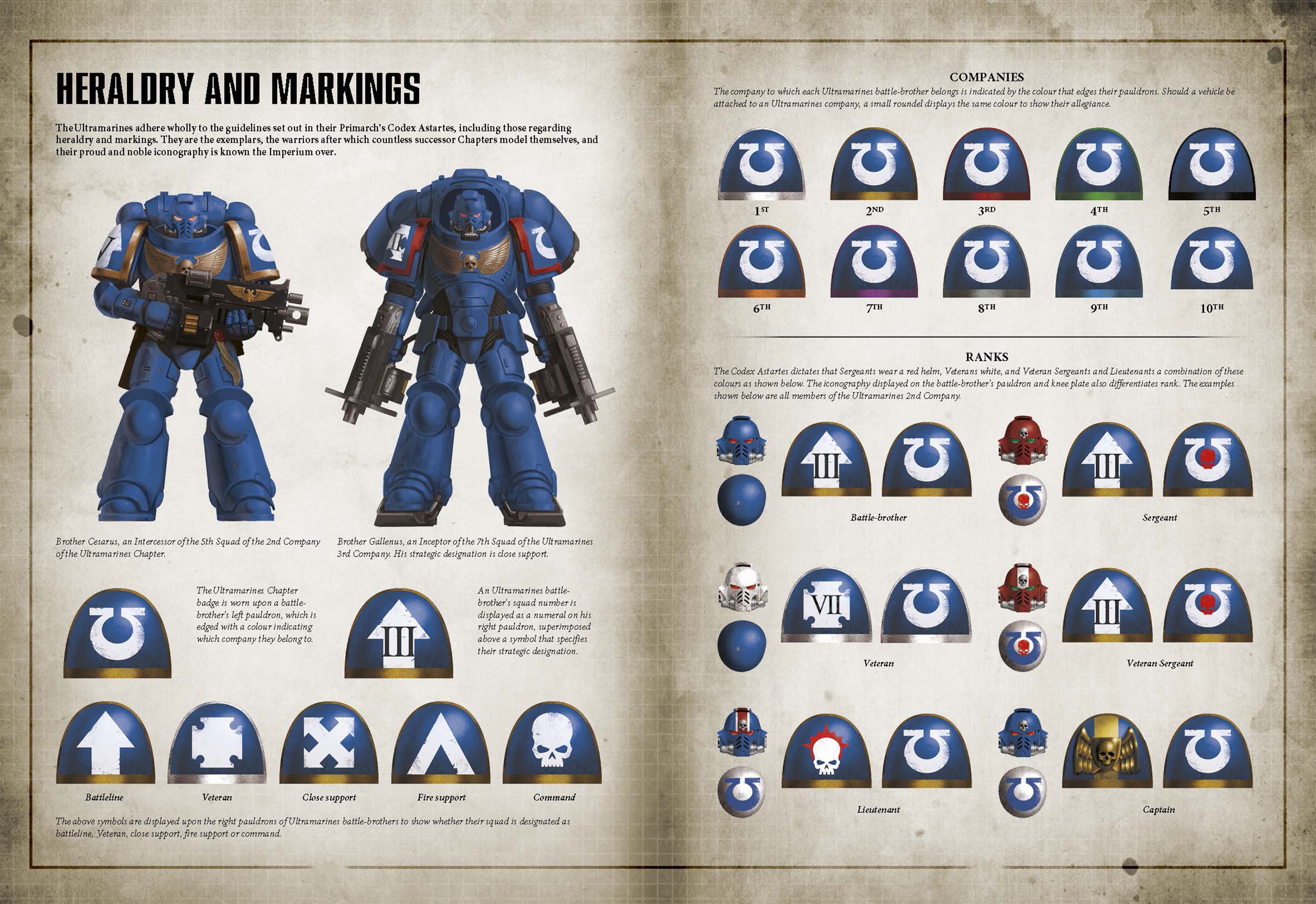 Each battle-brother absorbs and analyses entire chapters of the Codex, so that after several standard centuries of service he is at once a master and a scholar of his chosen area of expertise. Within a company, especially a low-numbered one consisting of numerous long-service Veterans, it is likely that the entire Codex Astartes will be known by the battle-brothers, allowing its commanding captain to draw upon an enormous pool of wisdom as well as experience. A Veteran Ultramarines battle-brother is therefore a deeply learned individual, schooled in every nuance of the arts of war and the wisdom of his primarch.