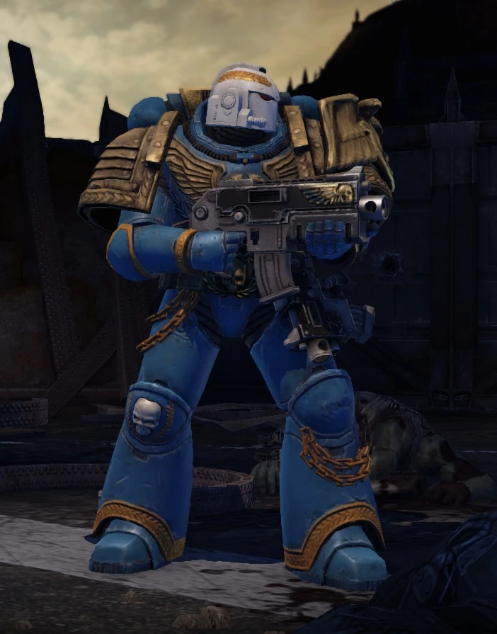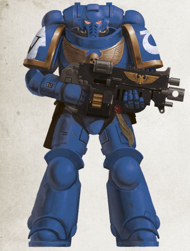 A Veteran Ultramarine in Mark VII Aquila Power Armour armed with a boltgun as depicted in Warhammer 40,000: Space Marine.