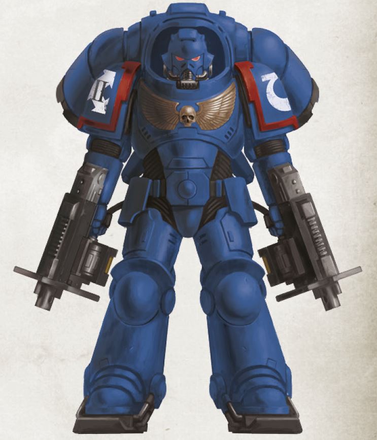 Ultramarines Chapter colour scheme as displayed by a Firstborn Space Marine in Mark VII Aquila Power Armour.