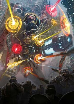 A Traitor Imperator-class Titan of the Legio Mortis protected by its Void Shield during the Siege of Terra.