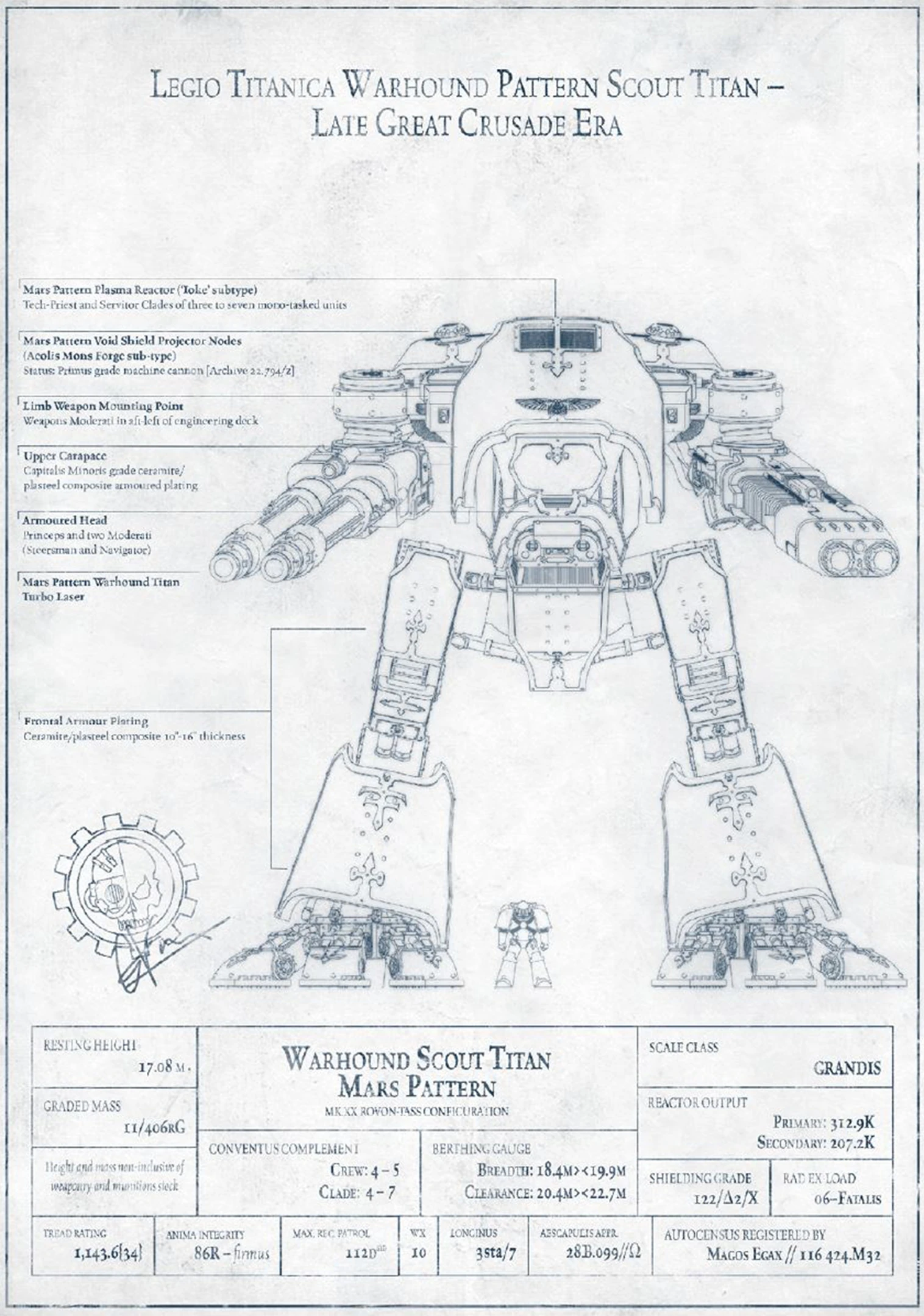 Schematic of a Warhound Pattern Scout Titan dating to the late Great Crusade era in M30 with Firstborn Space Marine for size comparison.